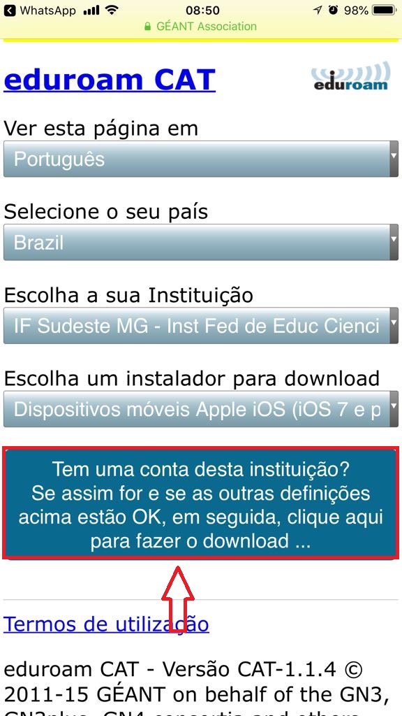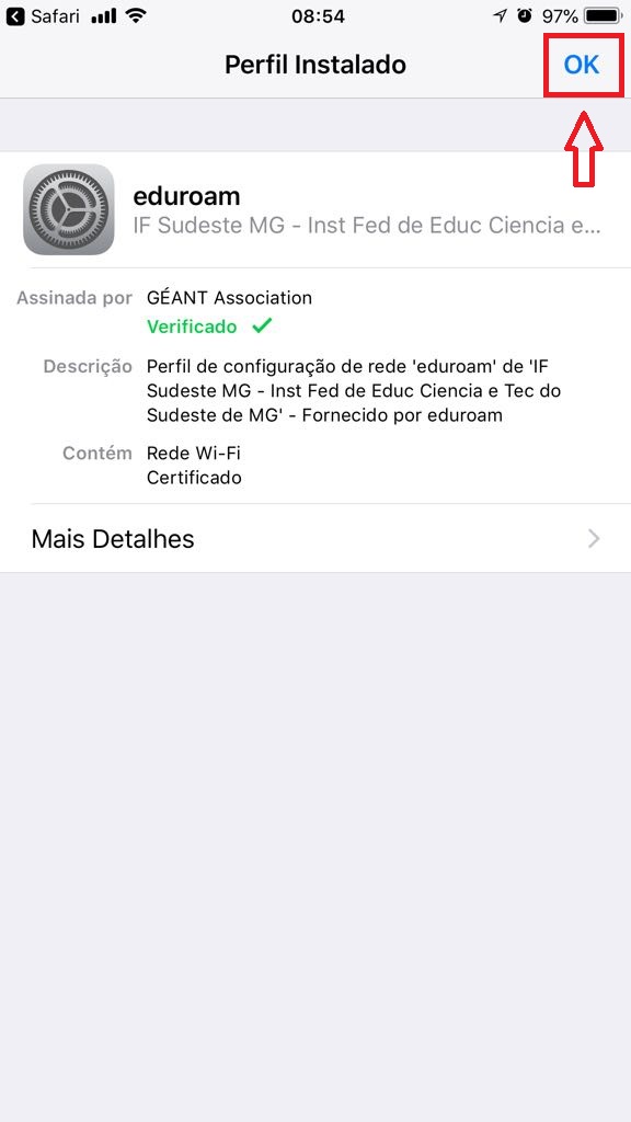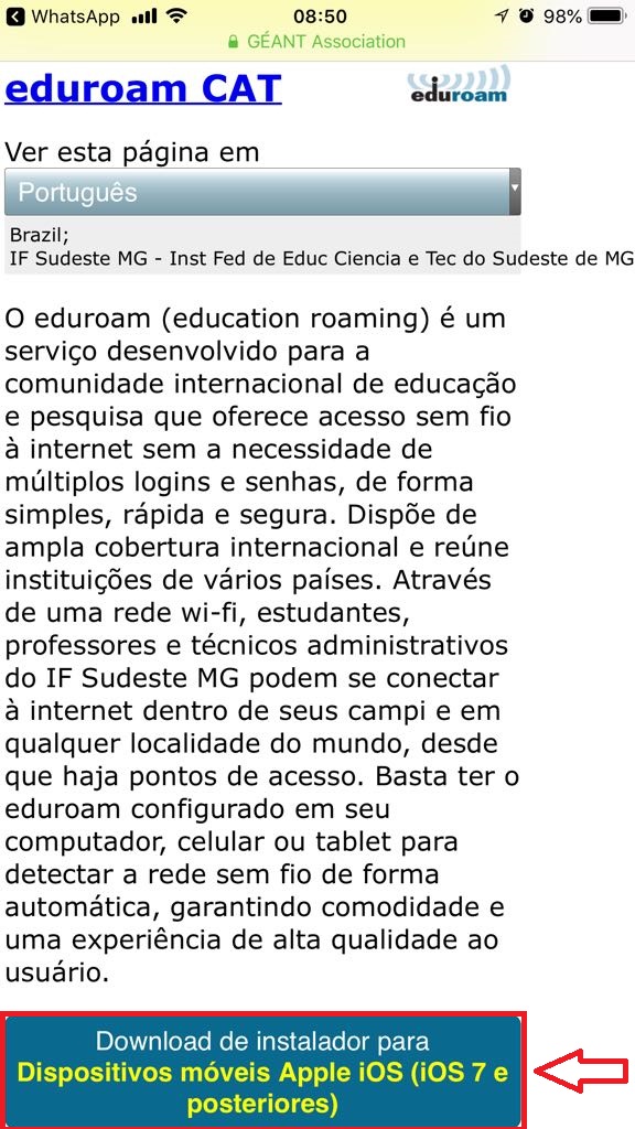 Para realizar a conexão ao Eduroam em dispositivos iOS, é necessário executar um arquivo de configurações, que pode ser baixado em: https://cat.eduroam.org/?idp=1500 (este endereço capturará as informações de seu dispositivo automaticamente).
