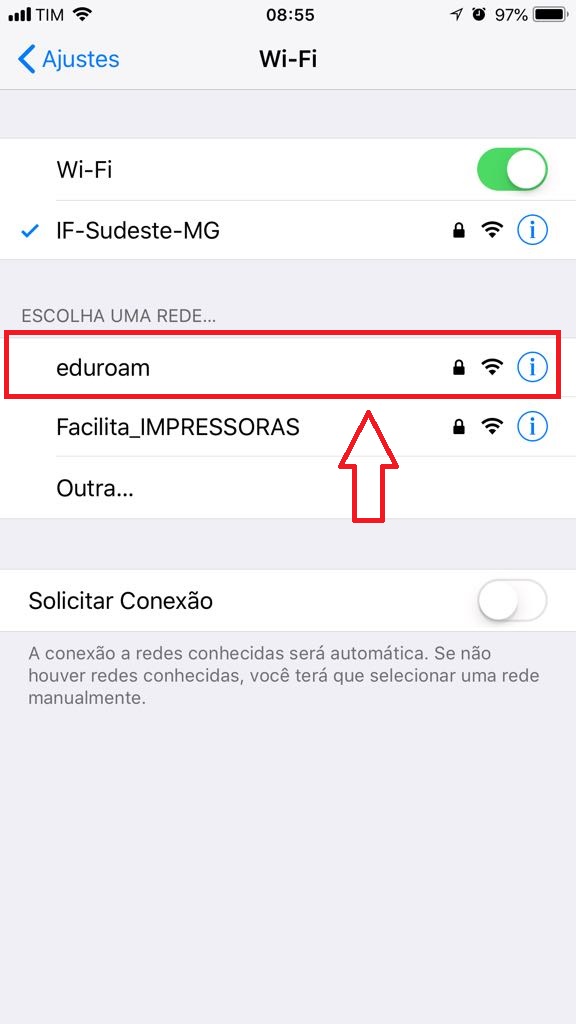 - Agora falta alterar a Rede. Selecione a Rede Eduroam para conectar-se.