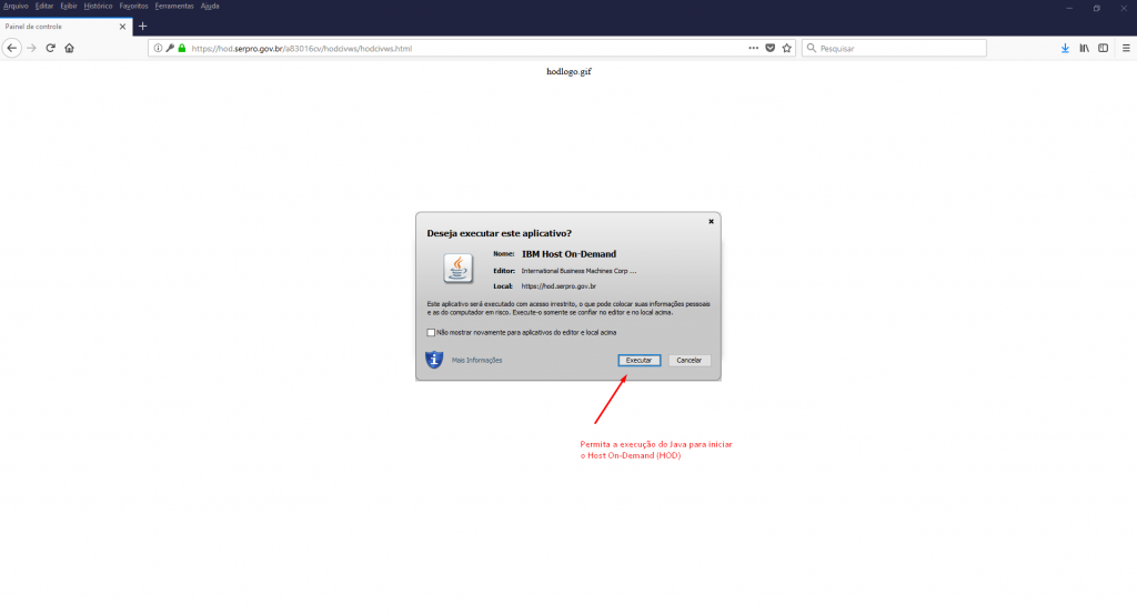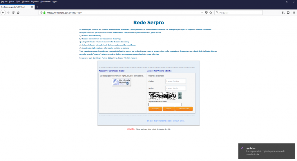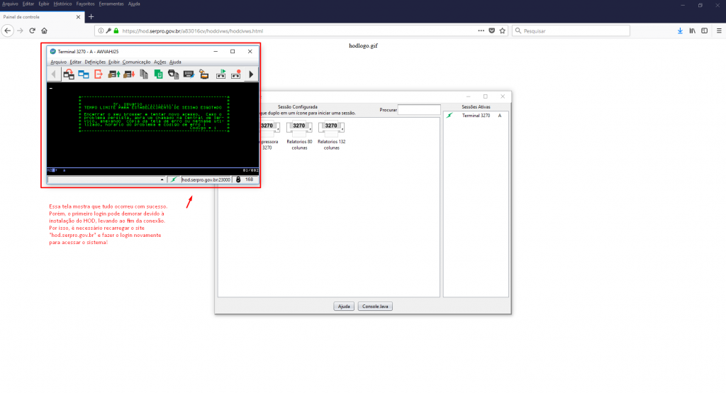 - Atenção, no primeiro acesso, devido à instalação, a demora para acesso leva a que o HOD se desconecte. Será necessário fechar o terminal, acessar novamente https://hod.serpro.gov.br/ e voltar a conectar. Dessa vez será mais rápido.