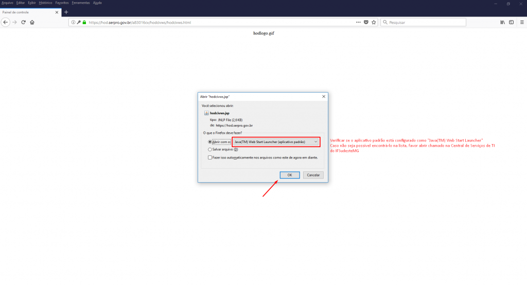 - Um arquivo será baixado, o Firefox irá sugerir abrir o arquivo com o Aplicativo "Java(TM) Web Start Launcher". Verifique e clique em Ok.