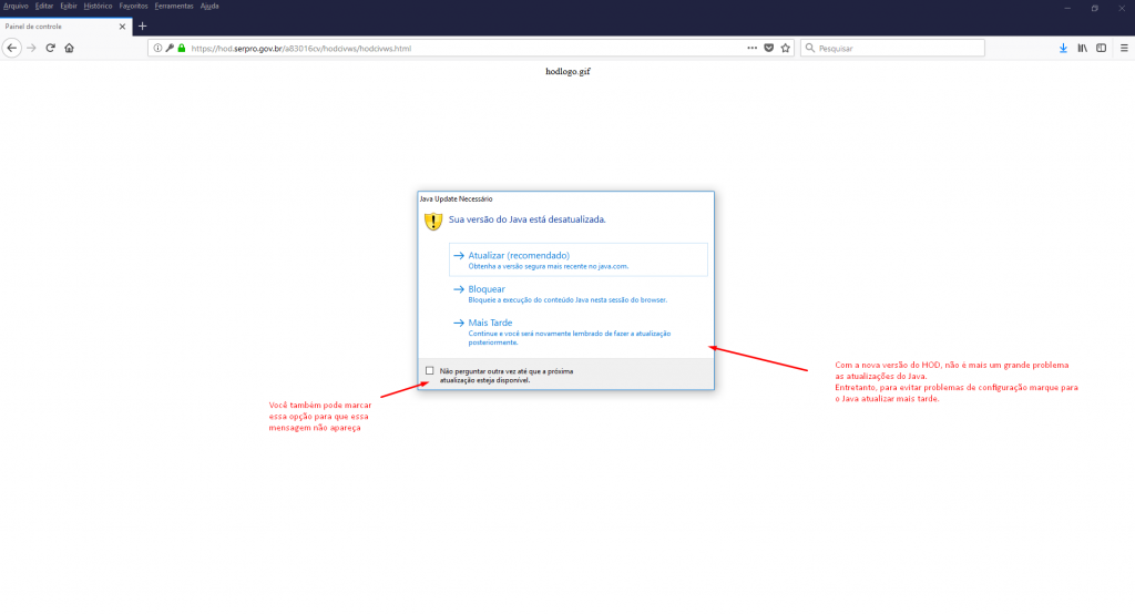 - Caso a mensagem de atualização surja, você pode ignorá-la ou permitir a atualização. Para evitar erros, mantenha a versão atual do Java. O novo sistema do HOD não tem problemas com versões mais atualizadas do Java.