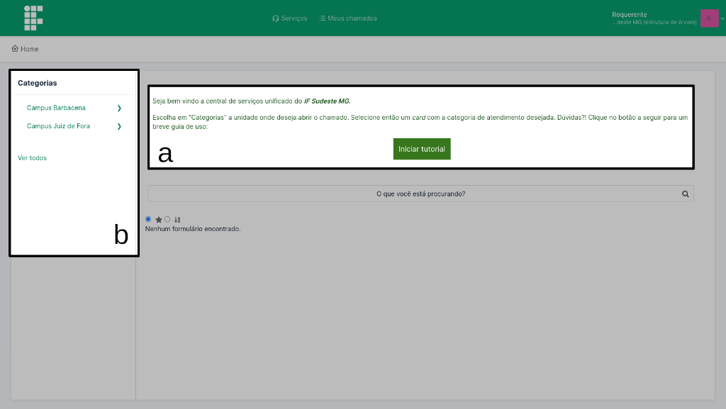 Ao entrar no sistema, observe as duas seções indicadas na Figura 2. Na região a vê-se o cabeçalho com a mensagem de boas vindas e o acesso a um simples tutorial de funcionamento do sistema. Na área b você deve escolher a unidade na qual o chamado será aberto.