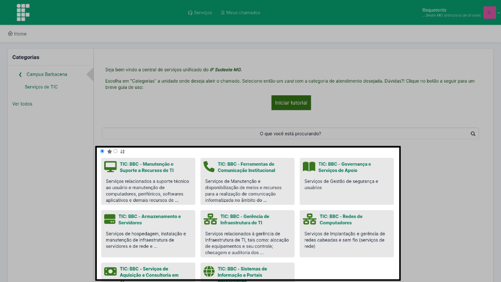 Serão abertos pequenos cards com os grupos de serviços disponíveis para a unidade selecionada. A listagem e o descritivo destes serviços podem ser verificadas no Cardápio de serviços. Estes "cards" possuem uma nomenclatura própria que indica Serviço: Unidade - Grupo de Atendimento. Como exemplo, na Figura 3 vê-se que o primeiro card seria para um atendimento da área de TIC, no campus Barbacena e que se refere a um atendimento relacionado ao grupo de Manutenção e Suporte a Recursos de TI.