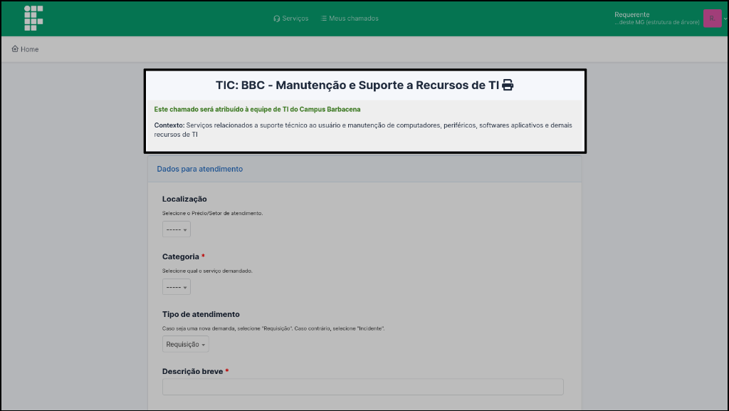A seleção de um card abrirá um formulário com a descrição do atendimento, a identificação da unidade para a qual o chamado será endereçado (Figura 4) e uma série de campos simples para que você descreva o problema ocorrido ou a solicitação desejada.