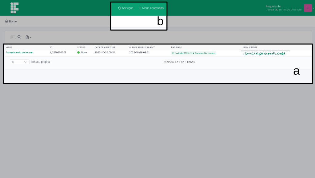 A partir daí é possível acessar a lista de chamados já abertos por você, como pode ser visto na área a da Figura 6. Esta mesma área pode ser acessada no menu Meus chamados da área b. Para retornar ao menu que lista os serviços disponíveis, acesse o menu Serviços também na área b.