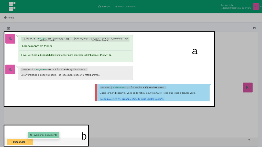 Ao selecionar um chamado a tela exibida será semelhante à da Figura 7. Na área a é possível verificar as mensagens trocadas entre você e o técnico que está lhe atendendo. Já na área b você pode optar por Responder um atendimento ou Adicionar documento.