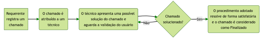 - Solucionado: chamado finalizado pelo técnico, porém, aguardando validação do usuário para fechar como solucionada ou recusada a solução adotada.