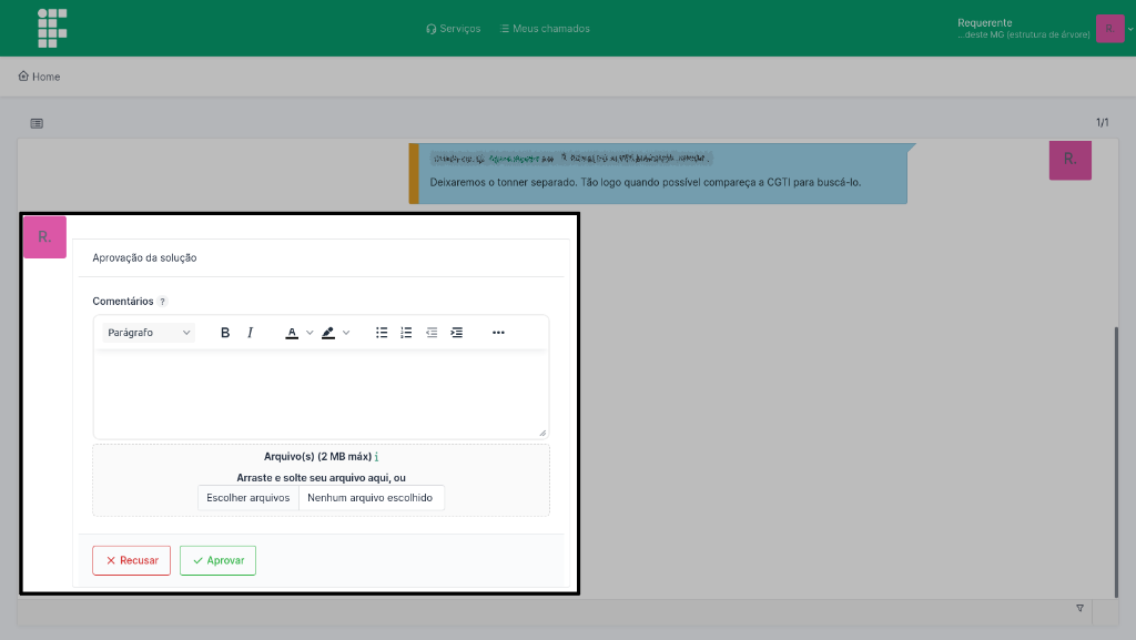 Assim que um técnico propor alguma solução para o atendimento, surgirá no interior do chamado um pedido de Aprovação da solução (como na Figura 8) e o status do chamado será Solucionado. Caso a solução seja aceita, o atendimento assumirá o status de Fechado, caso contrário retornará ao status Processando (atribuído).