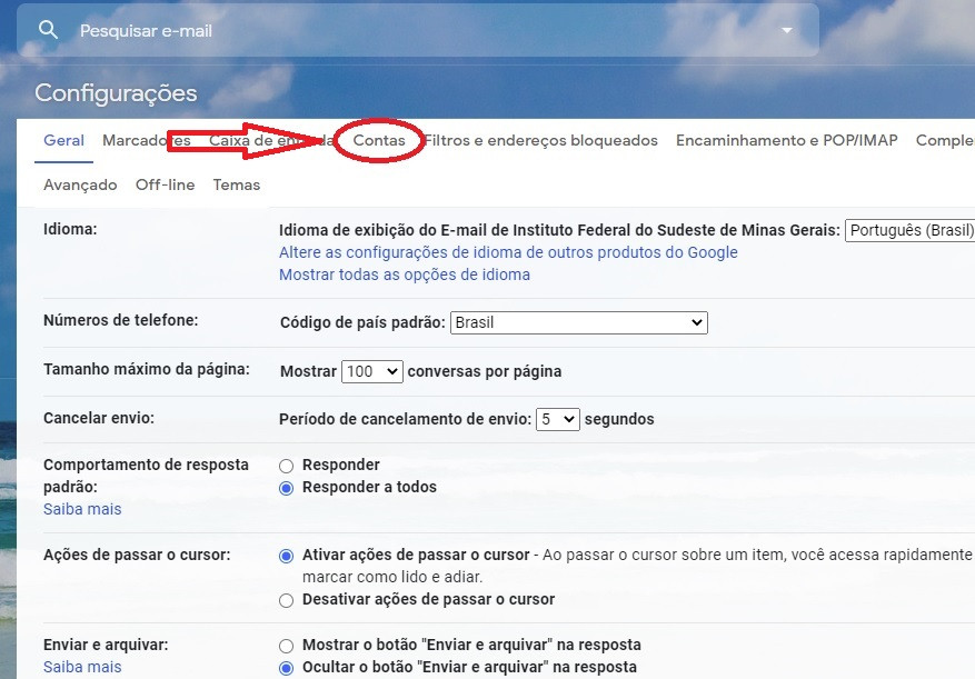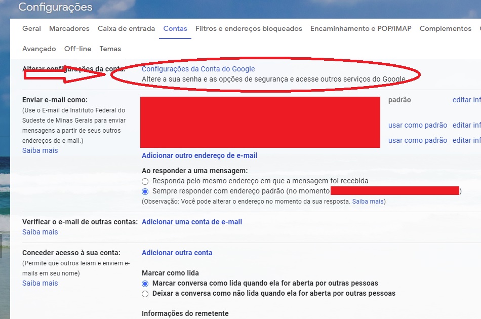 3-) Na tela de configurações selecione a aba "contas" e, a seguir, "Configurações da conta google".