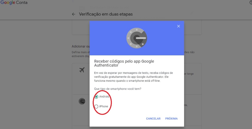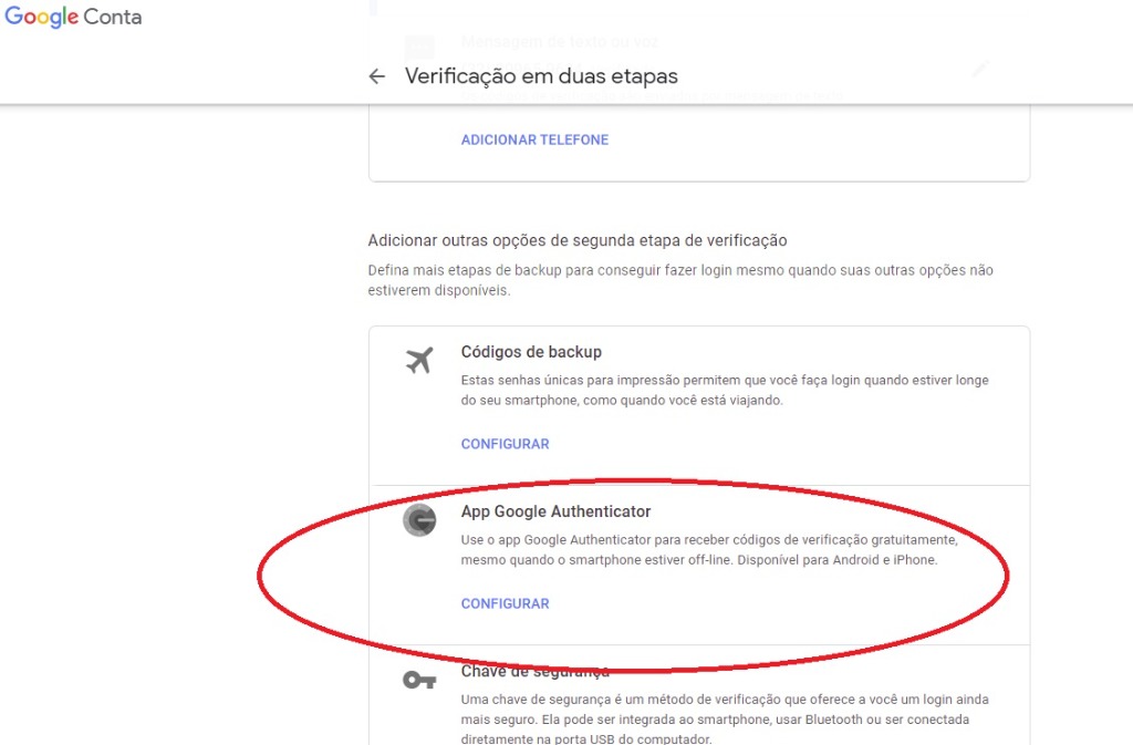 3- Na sua Conta do Google, vá para a seção "Verificação em duas etapas"e selecione App Google Authenticator.