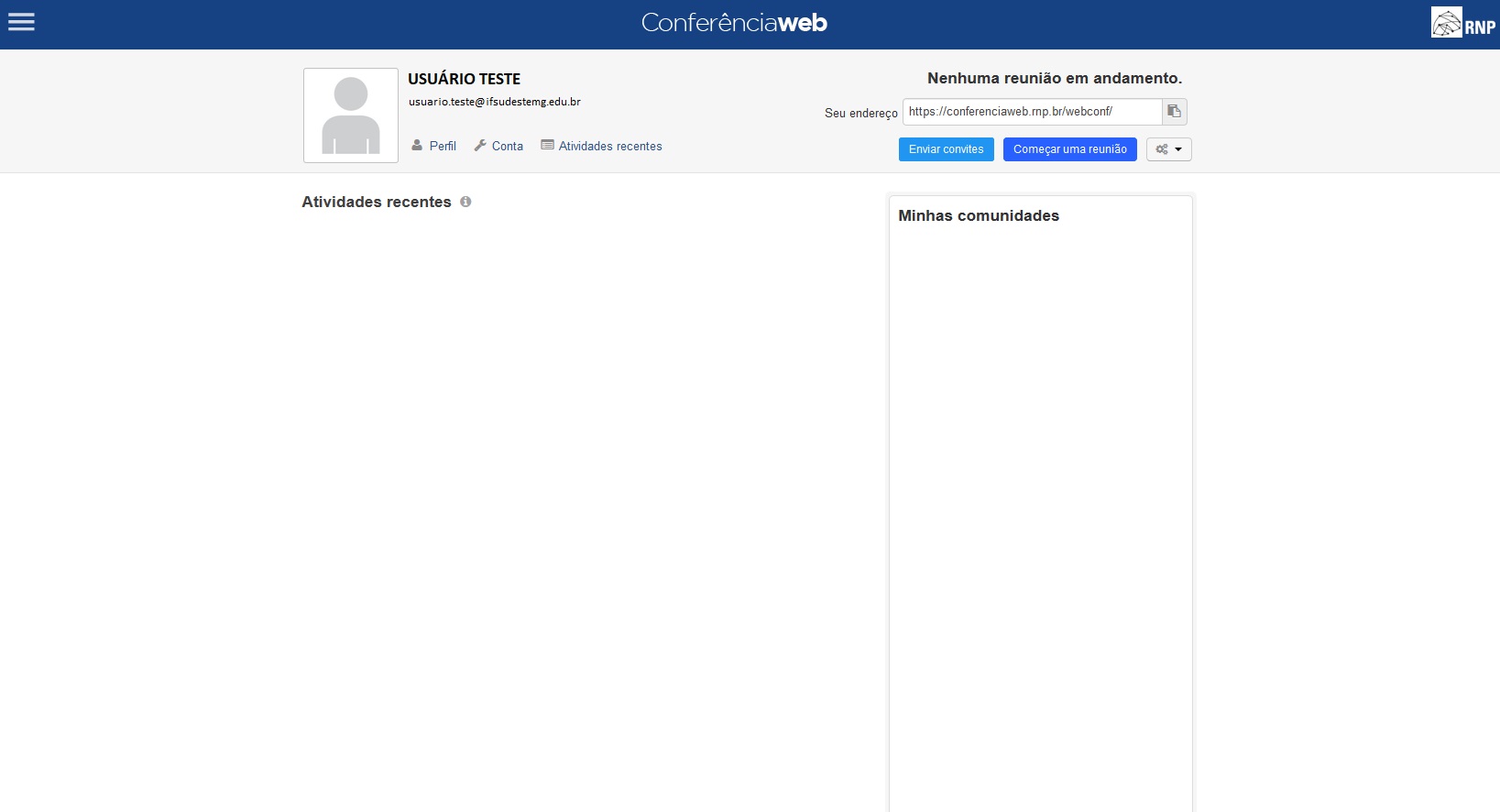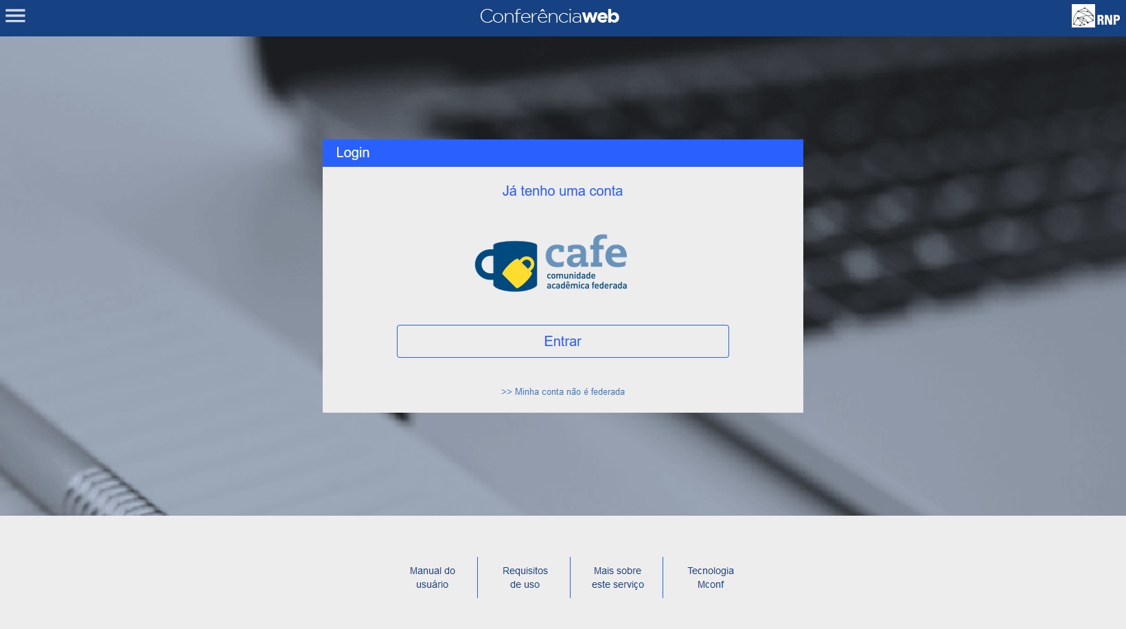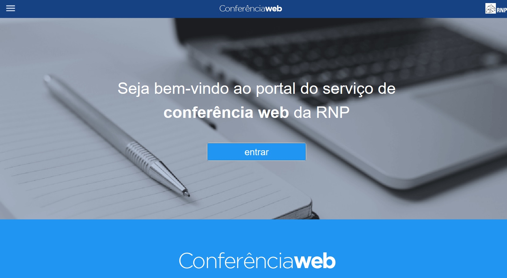 1. Acesse https://conferenciaweb.rnp.br/ e clique em "entrar" para dar continuidade ao acesso;