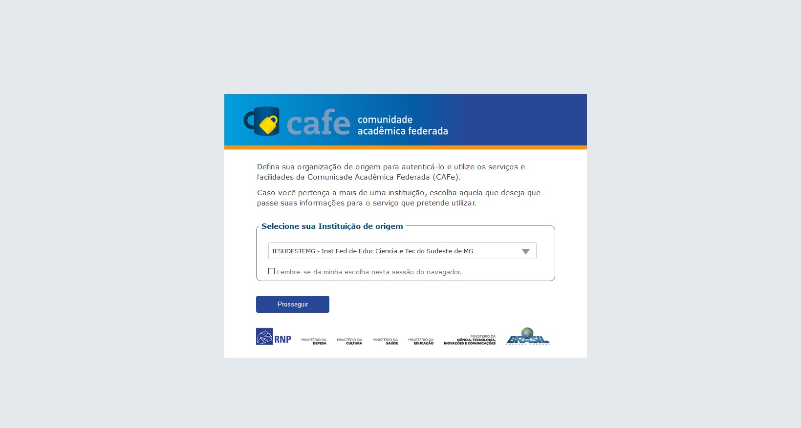 3. Selecione a sua instituição "IF Sudeste MG" e clique em prosseguir;
