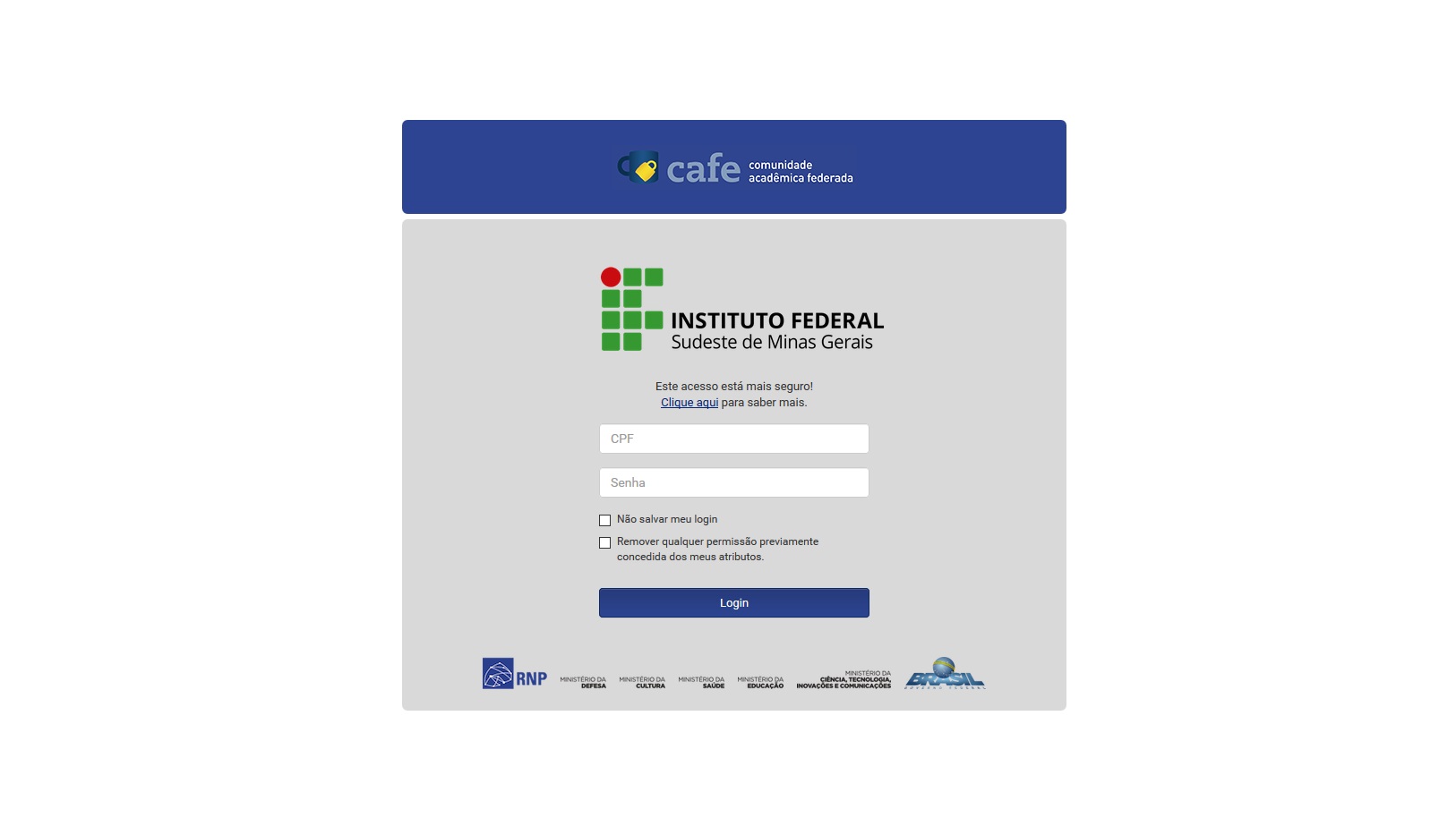 2. Como o IF Sudeste MG já está incluído no portal da CAFe (Comunidade Acadêmica Federada), clique em "entrar";