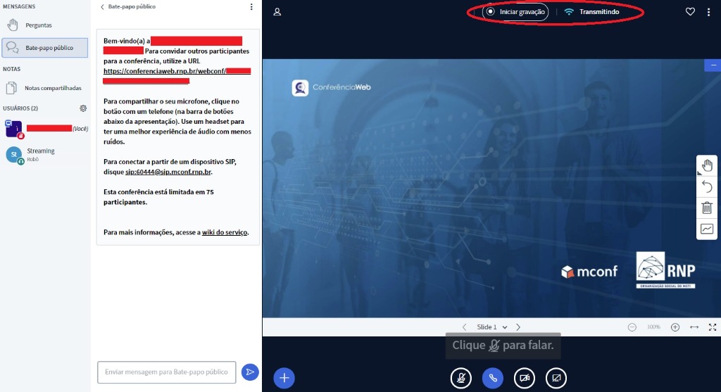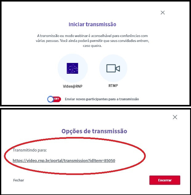 - Se a opção ligar estiver desmarcada (OFF), o organizador terá a opção de escolha dos participantes que entrarão no ambiente do Conferência Web (normalmente pelo link da reunião) e aqueles que assistirão via transmissão (pelo link da figura acima).