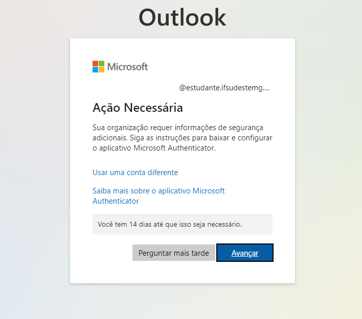 Se optar por não realizar a autenticação em duas etapas nesse momento, poderá prosseguir clicando no botão PERGUNTAR MAIS TARDE.